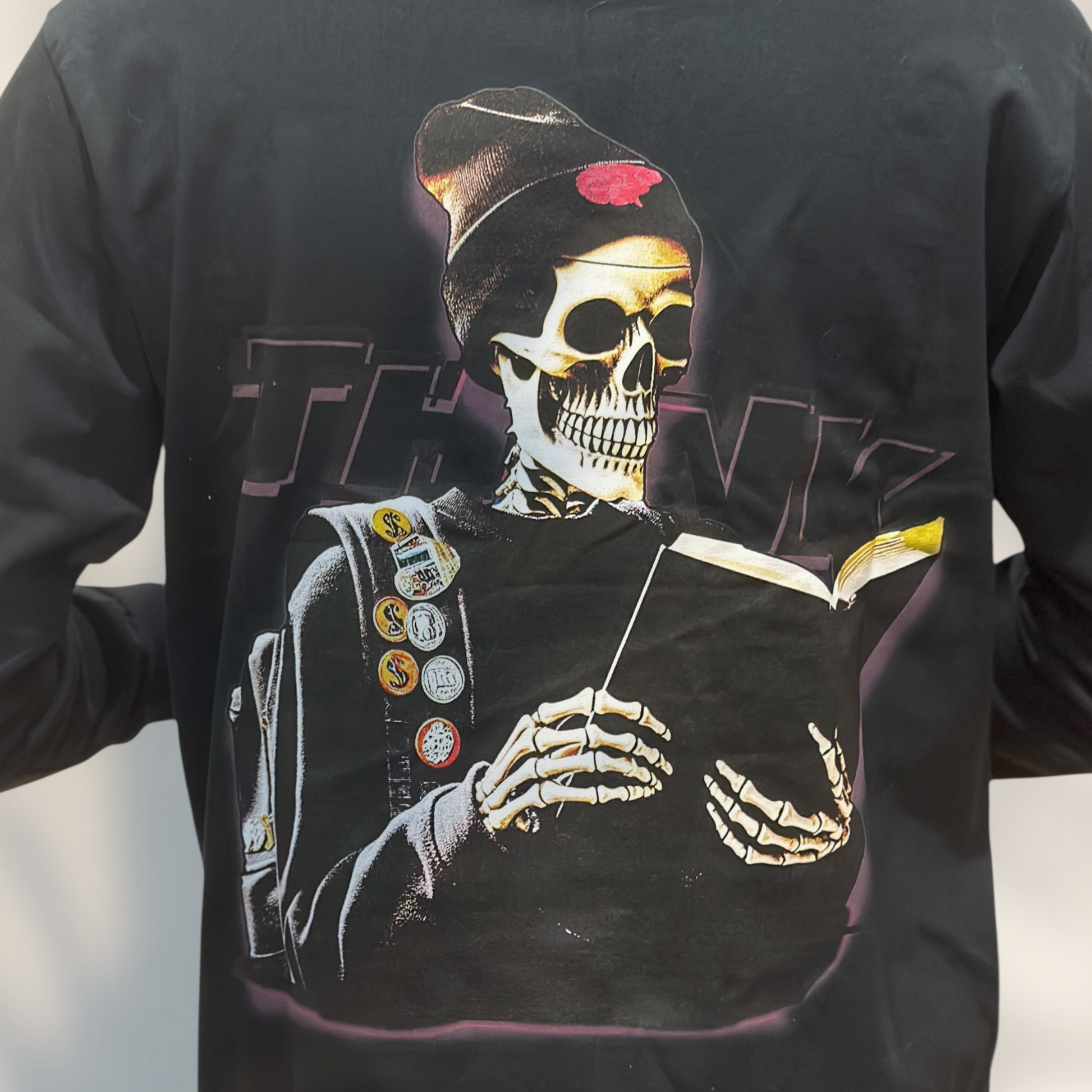 Experience effortless layering and casual style with this heavyweight long sleeve shirt. The relaxed drop-shoulder fit and crew neckline provide a comfortable, laid-back look. Made from 100% cotton, it's both comfortable and easy to care for, with a skeleton reading design on the back and a sleek logo on the front. Machine washable for convenience.